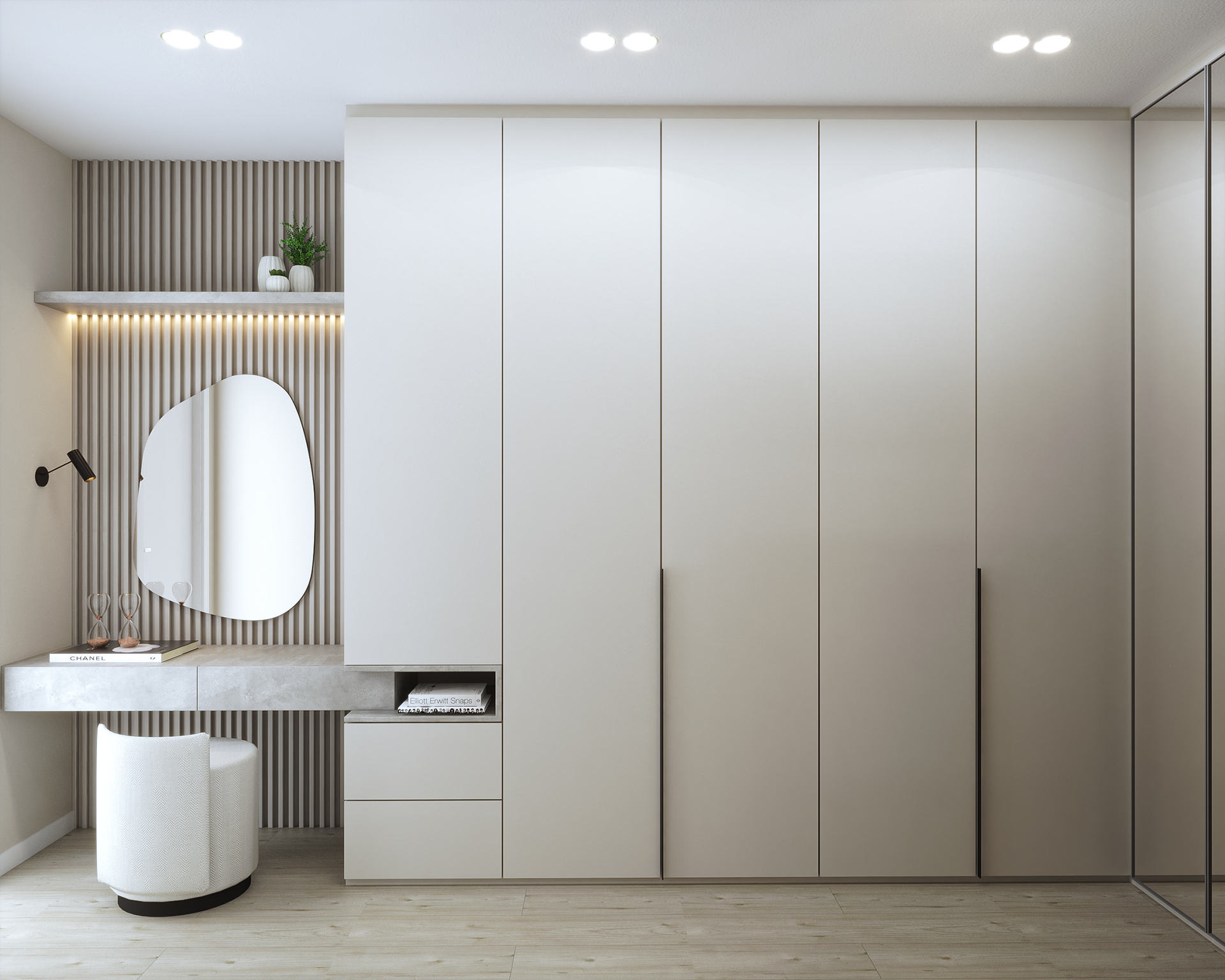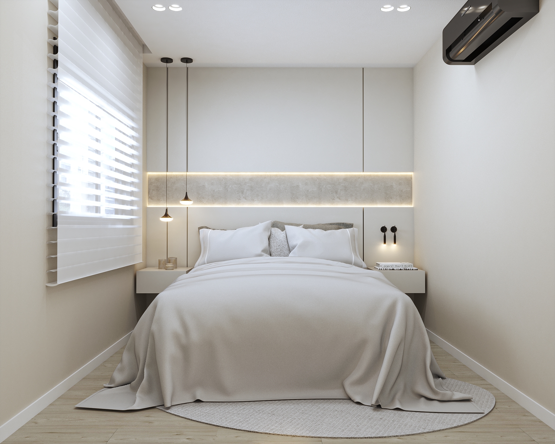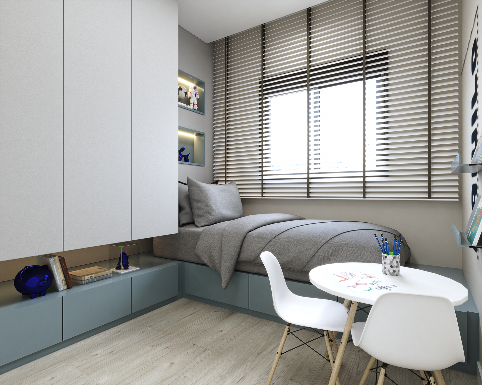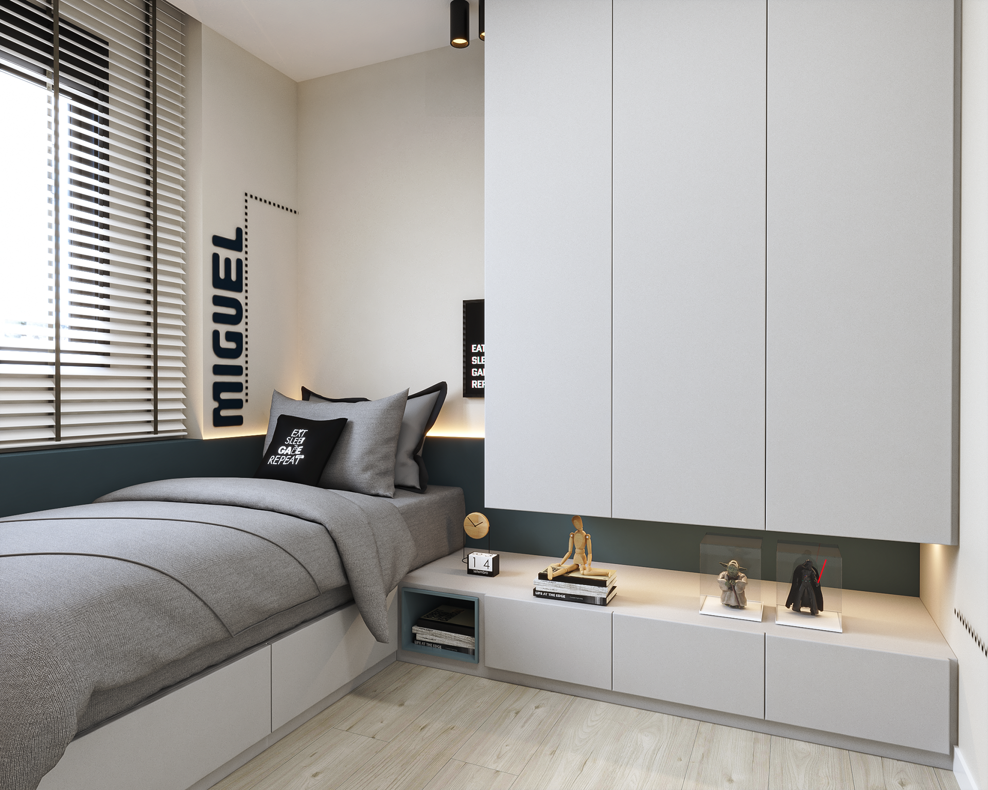 Neste projeto, criamos soluções sob medida para cada ambiente. No quarto, o mobiliário foi projetado para otimizar o espaço, trazendo conforto e sofisticação.