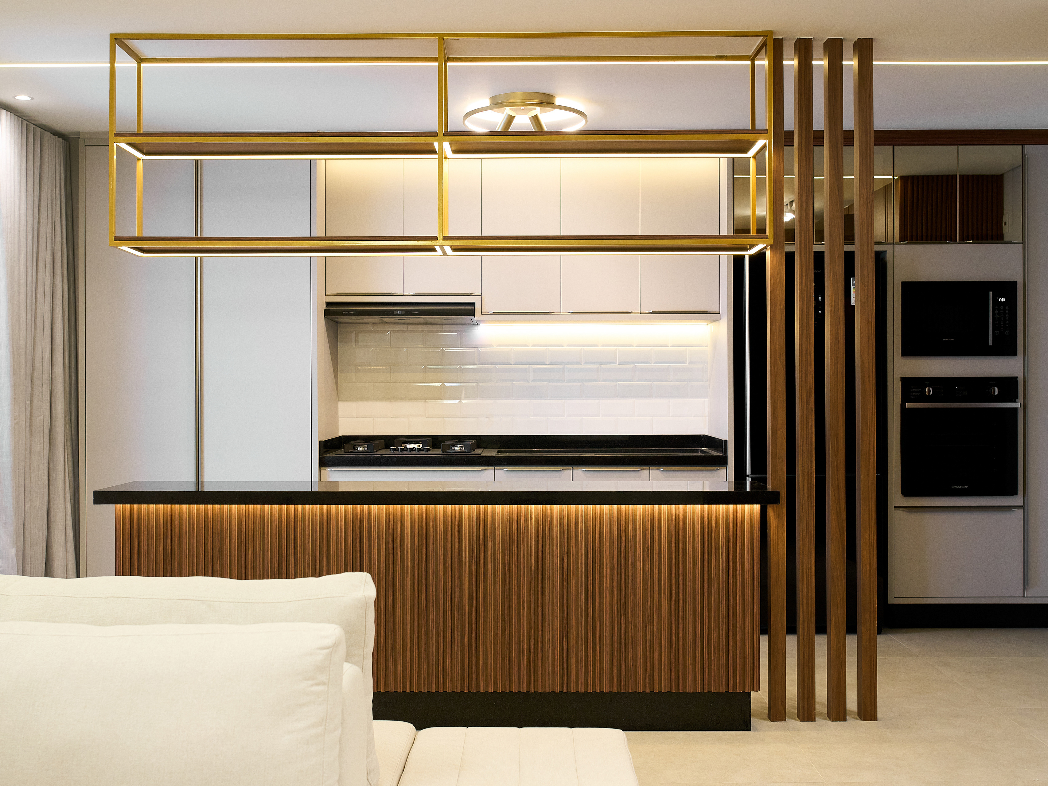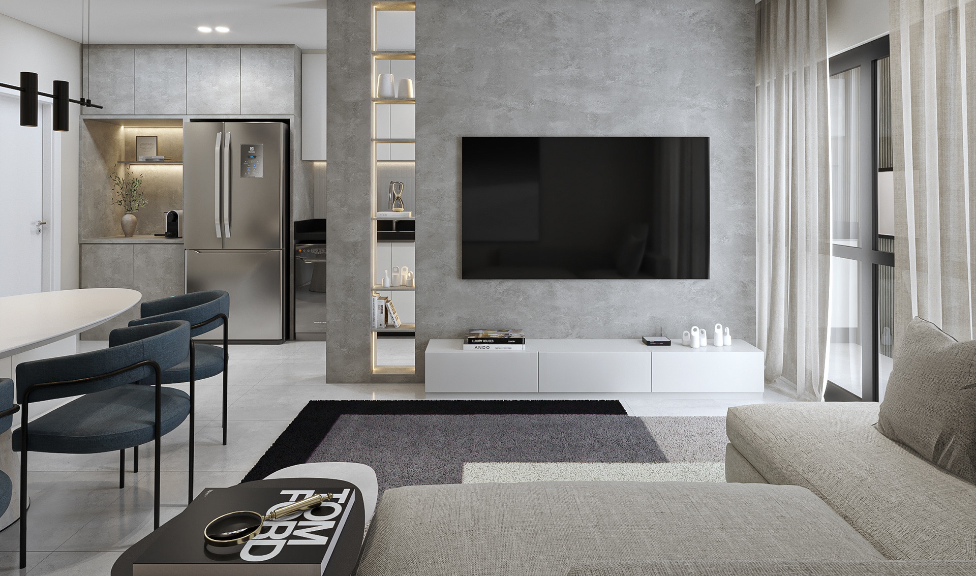 Nos banheiros, priorizamos funcionalidade e design. A sala de estar ganhou um toque de elegância, enquanto a varanda se transformou em um ambiente aconchegante e moderno.